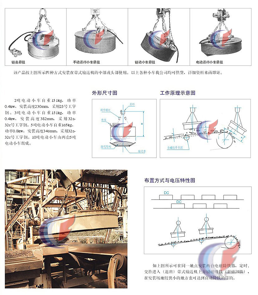 本系列產(chǎn)品為長(zhǎng)期工作制的電磁除鐵器,配有三組鏈條,可調(diào)掛鉤,能方便地調(diào)整架設(shè)高度和安裝高度。其透磁深度大,最適于從較厚料層和較大粒度礦石、煤炭、焦炭、石灰石、碎石中除去鐵磁性異物。
